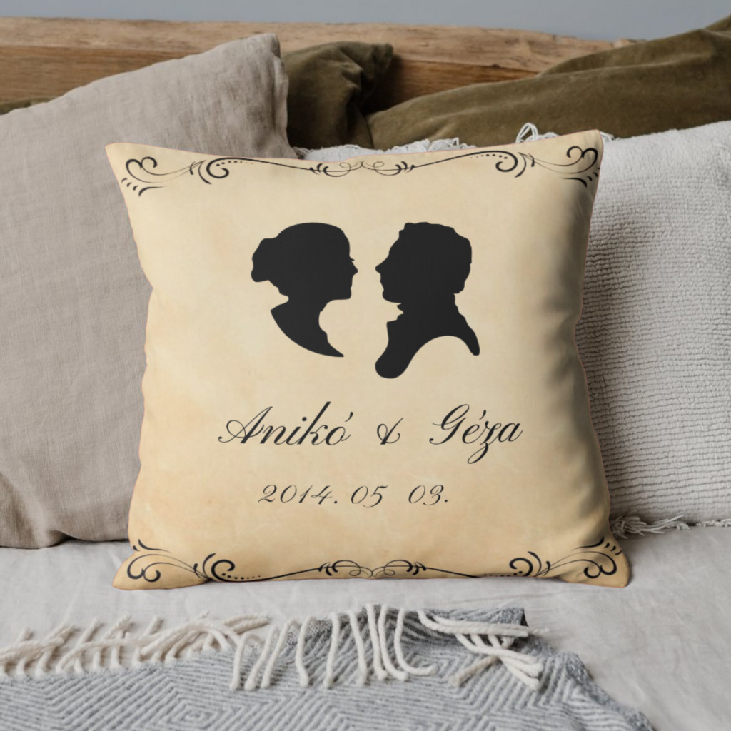 Vigyen egy csipetnyi regency-kori eleganciát otthonába, vagy lepje meg szeretteit egy valóban fejedelmi ajándékkal! Ez a bézs tónusú, prémium díszpárna a 19. századi Anglia romantikáját idézi, modern és letisztult formában. A párna központi eleme egy klasszikus női és férfi árnyportré (sziluett), amely az örök köteléket szimbolizálja.