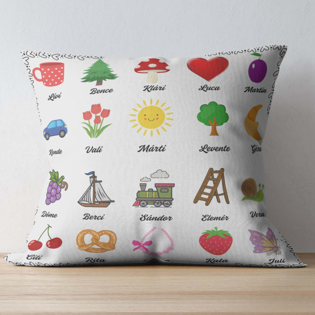 A párna egyik oldalán az óvodás csoport neve és jele kap helyet, míg a másik oldalon a gyerekek nevei és jelei jelennek meg. Ezáltal minden egyes darab teljesen egyedi, és a közösen eltöltött idő legszebb pillanatait idézi fel.